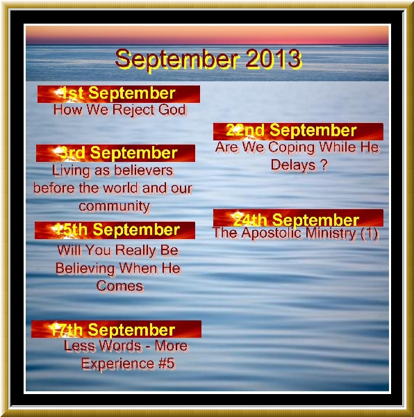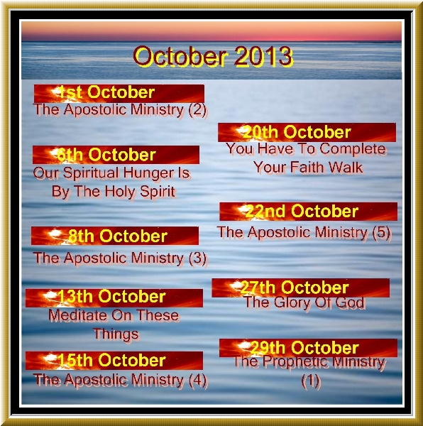How We Reject God  1st September 2013  Pastor Kim Living as believers before the world and our community  3rd September 2013  Pastor Kim Will You Really Be Believing When He Comes  15th September 2013  Bro Bob Less Words - More Experience #5  17th September 2013  Bro Bob Are We Coping While He Delays ?  22nd September 2013  Pastor Kim The Apostolic Ministry (1)  24th September 2013  Bro Bob The Apostolic Ministry (2)  1st October 2013  Bro Bob Our Spiritual Hunger Is By The Holy Spirit  6th October 2013  Pastor Kim The Apostolic Ministry (3)  8th October 2013  Bro Bob Meditate On These Things  13th October 2013  Pastor Kim The Apostolic Ministry (4)  15th October 2013  Bro Bob You Have To Complete Your Faith Walk  20th October 2013  Pastor Kim The Apostolic Ministry (5)  22nd October 2013  Bro Bob The Glory Of God  27th October 2013  Pastor Kim The Prophetic Ministry (1)  29th October 2013  Bro Bob